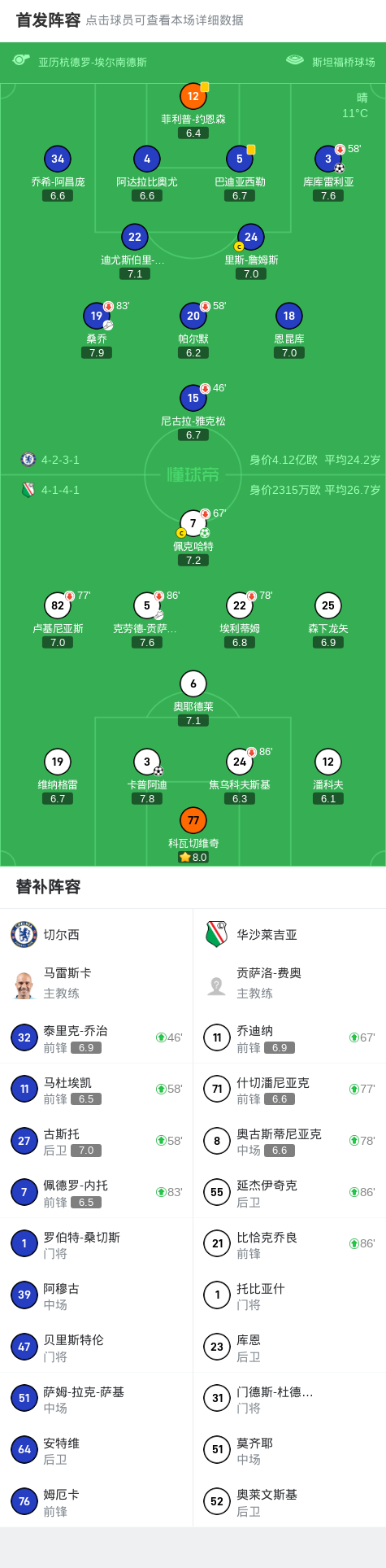 全场比赛结束,最终切尔西以1-2不敌华沙莱吉亚。两回合总比分为切尔西4-2华沙莱吉亚,切尔西成功晋级。毫无疑问,这场比赛是一场激动人心、精彩纷呈的对决。